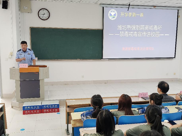 为筑牢青少年远离毒品的安全防线,深入落实大学生安全教育,9月6日,*漫画18 举办普法禁毒宣讲会。潍坊市强制隔离戒毒所康复训练中心副主任胡杨光、潍城司法局秘书科科长季军鹏等一行入校宣讲。*漫画18 党委副书记尹国欣、辅导员、2024级全体本科新生参加活动。