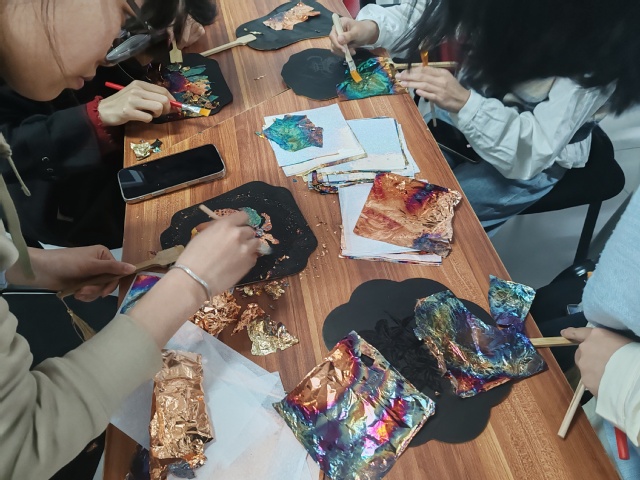 本次培训由邢鹏飞担任指导教师,特邀拥有多年美育经验的四位教师现场授课,以“理论+实操”模式指导师生将廉洁元素融入非遗手作。课堂上,各位美育老师带领大家体验烧箔画创作,从历史渊源到熨烫工艺细致讲解,指导在扇子等载体上绘制廉洁主题纹样;同时,老师们开展橡皮胶版画教学,手把手教授阴刻、阳刻技巧,助力零基础师生完成专属廉洁文创作品。